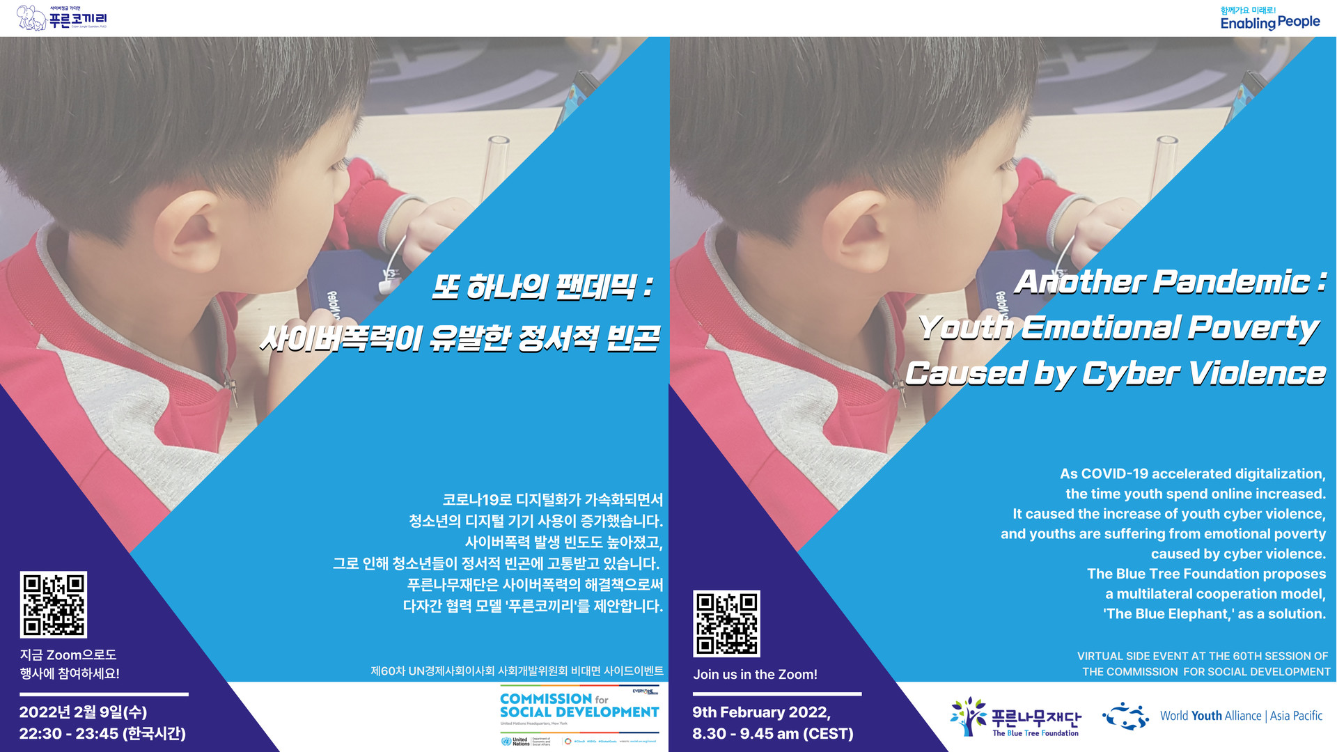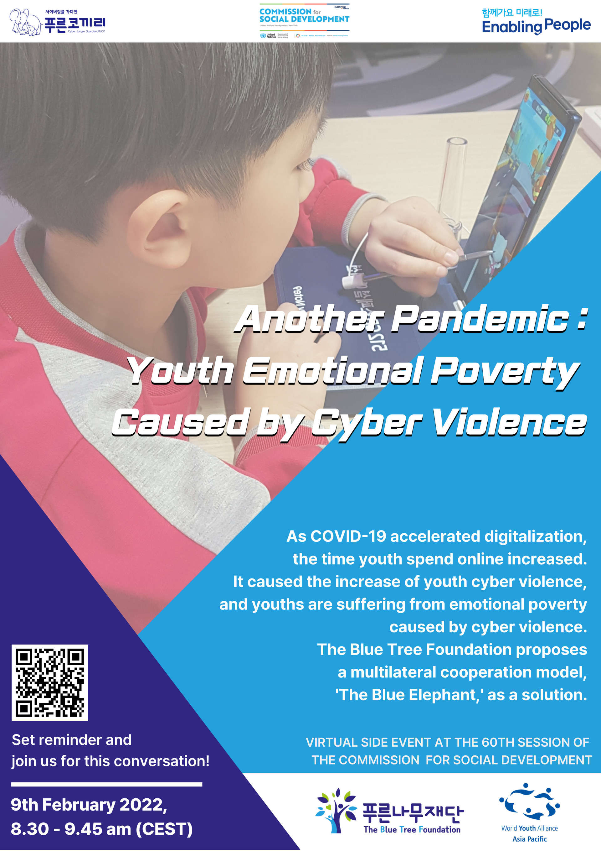 CSocD60의 대주제에 따라 푸른나무재단과 세계청소년연맹은 "또 하나의 팬데믹 : 사이버폭력이 유발한 청소년 정서적 빈곤의 현황과 해결방안"을 주제로 사이드이벤트를 개최합니다.